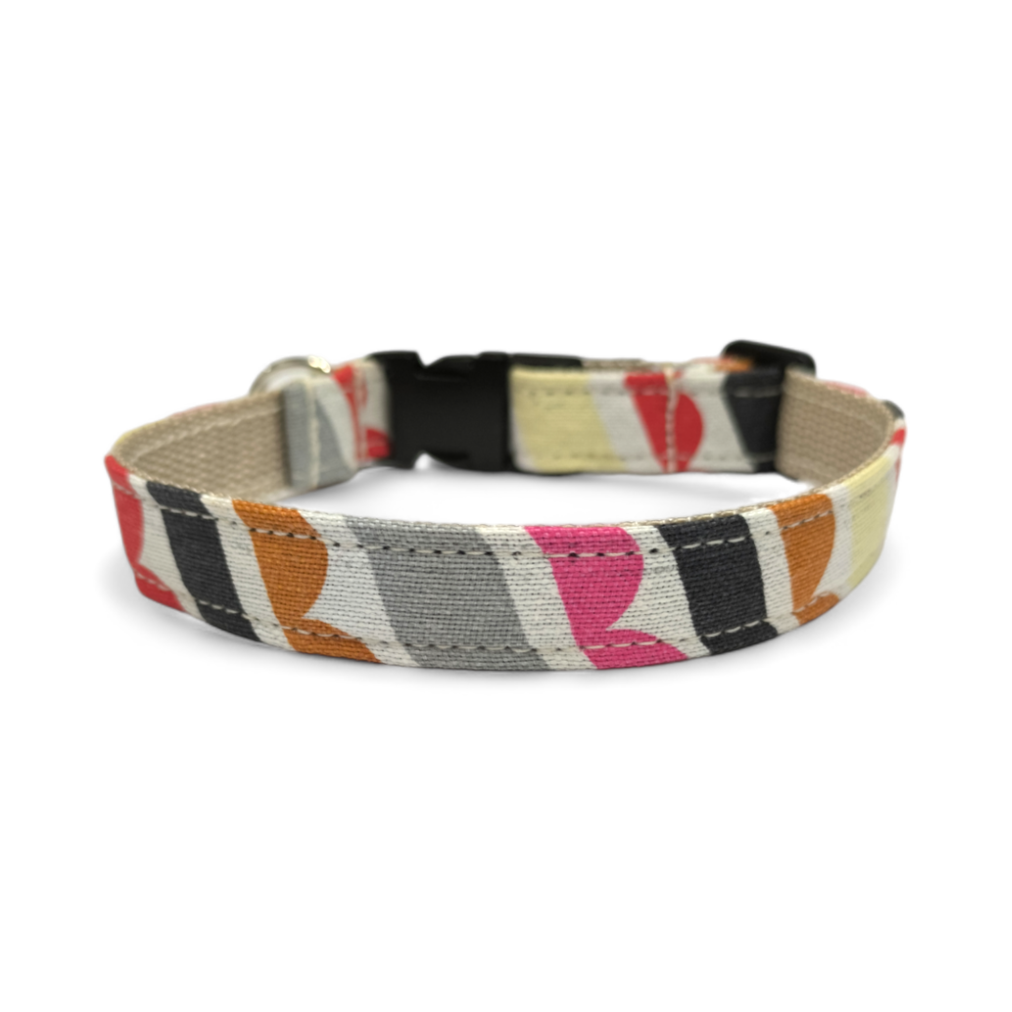 Collar regulable confeccionado en tela de alta calidad, interior con nailon resistente y cómodo. Disponible para todo tipo de perros. Se puede fabricar con diferentes acabados de fornituras (oro, plata, negro, etc.) y opción de personalizar con el logo de tu negocio.
