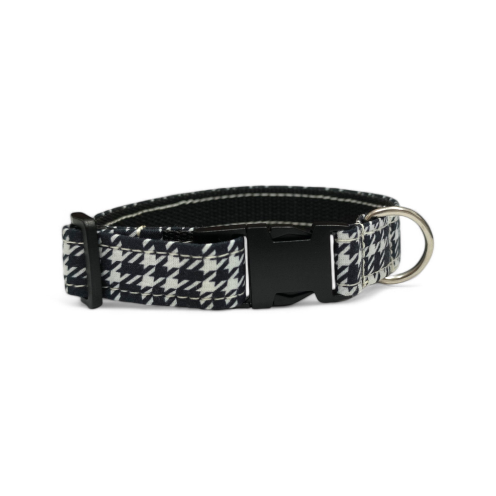 Collar regulable confeccionado en tela de alta calidad, interior con nailon resistente y cómodo. Disponible para todo tipo de perros. Se puede fabricar con diferentes acabados de fornituras (oro, plata, negro, etc.) y opción de personalizar con el logo de tu negocio.