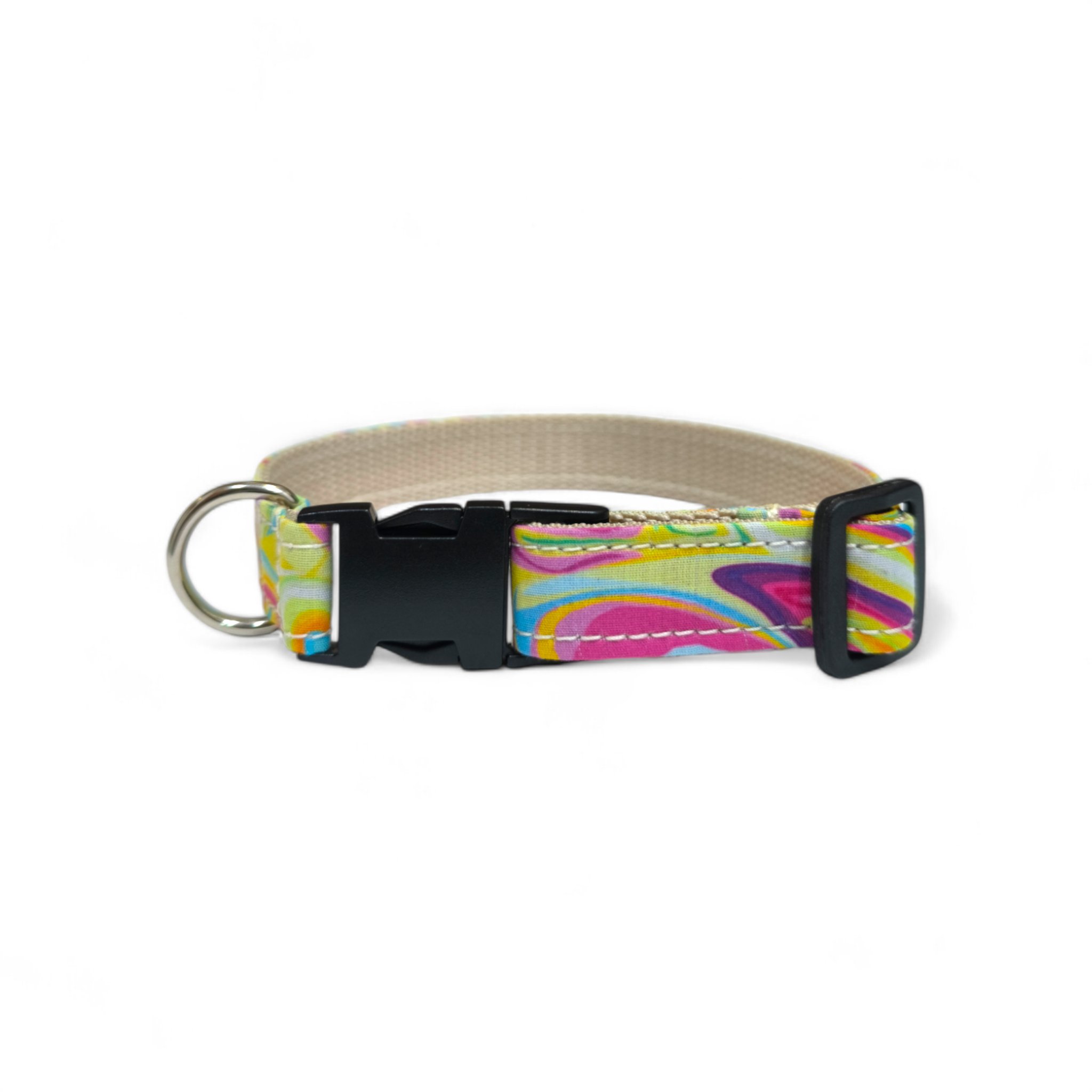 Collar regulable confeccionado en tela de alta calidad, interior con nailon resistente y cómodo. Disponible para todo tipo de perros. Se puede fabricar con diferentes acabados de fornituras (oro, plata, negro, etc.) y opción de personalizar con el logo de tu negocio.