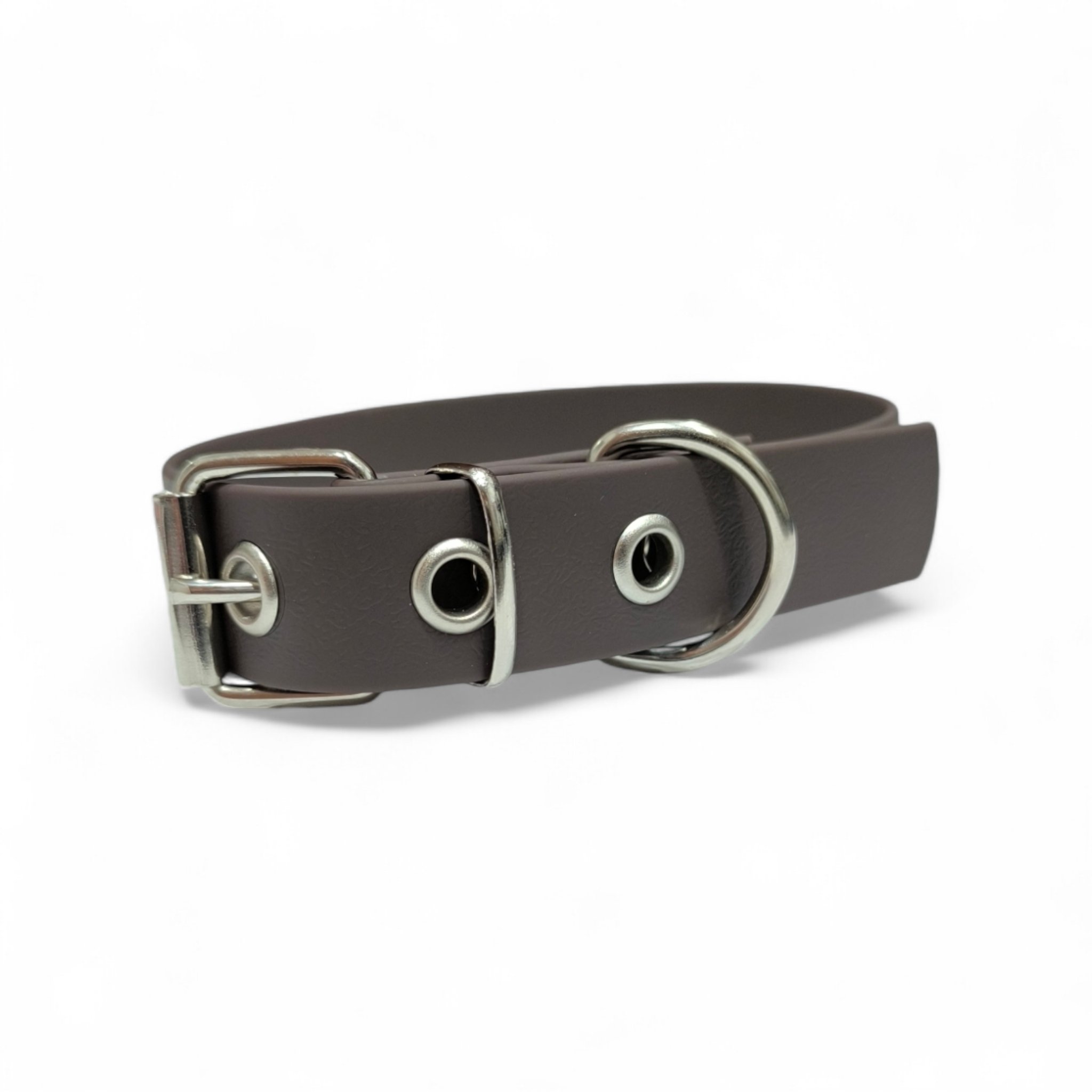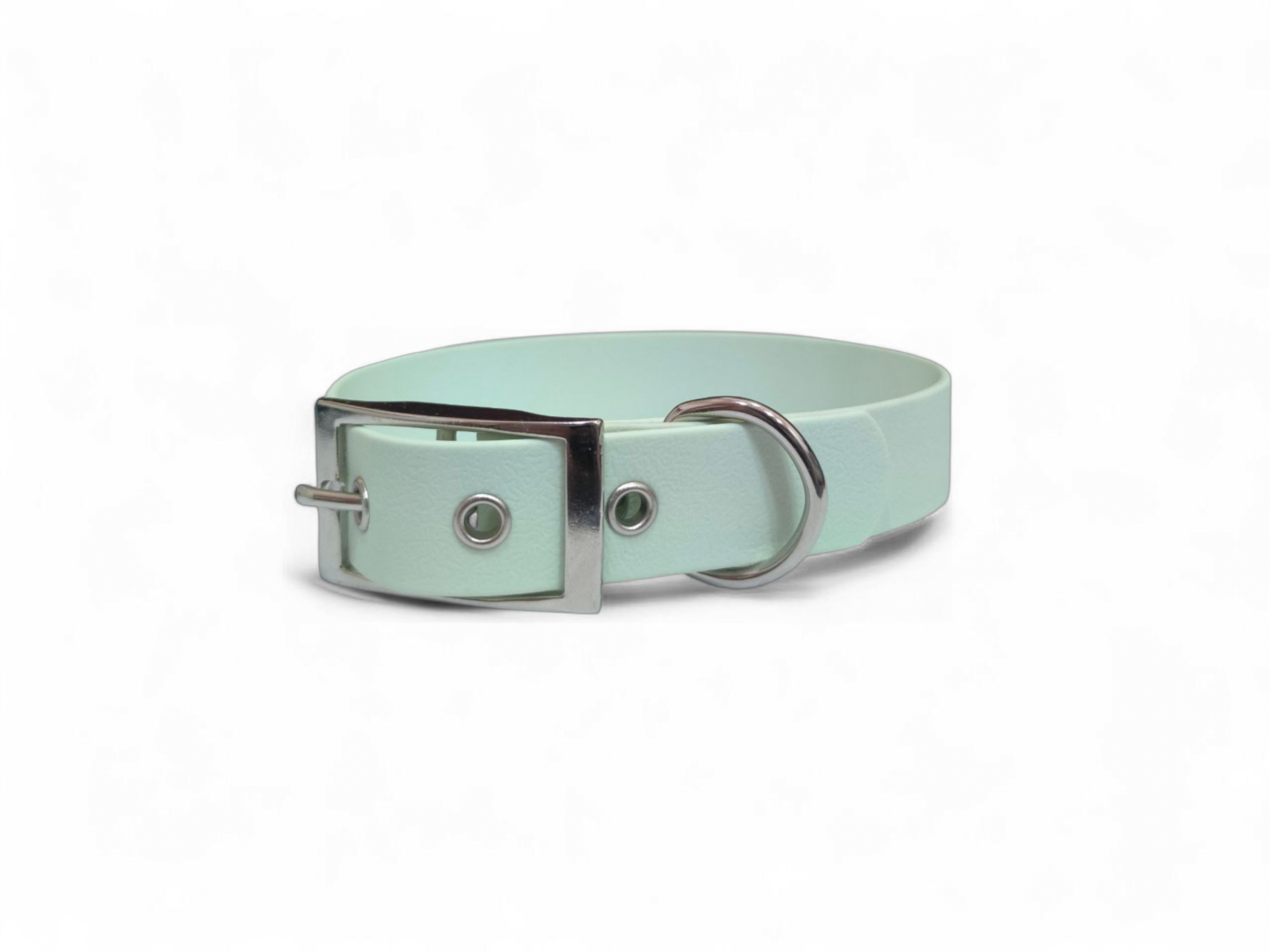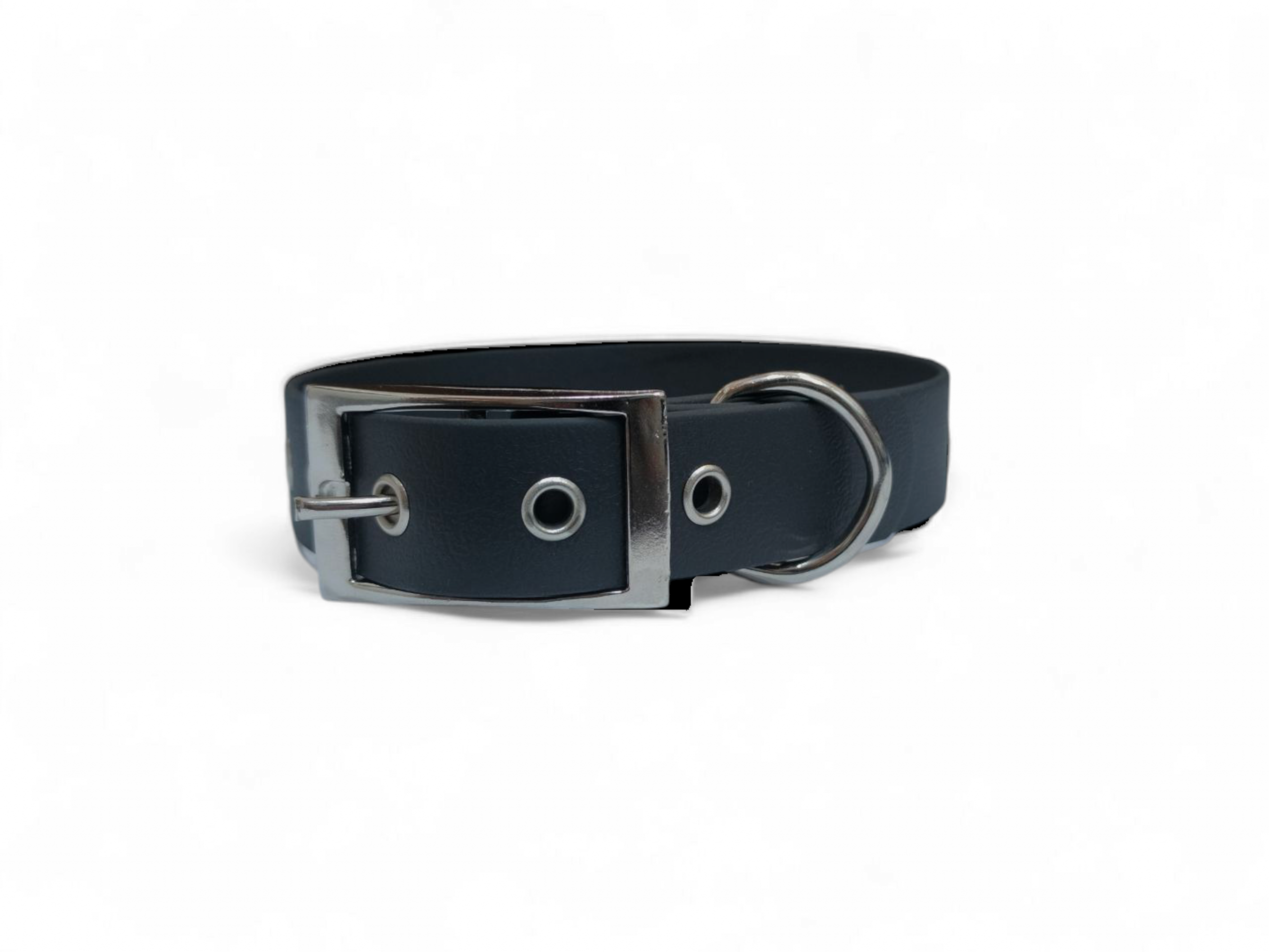 Collar impermeable fabricado en material resistente, ideal para perros activos. Fácil de limpiar, no absorbe humedad ni olores y mantiene su durabilidad incluso con uso diario, disponible para todos los tamaños.