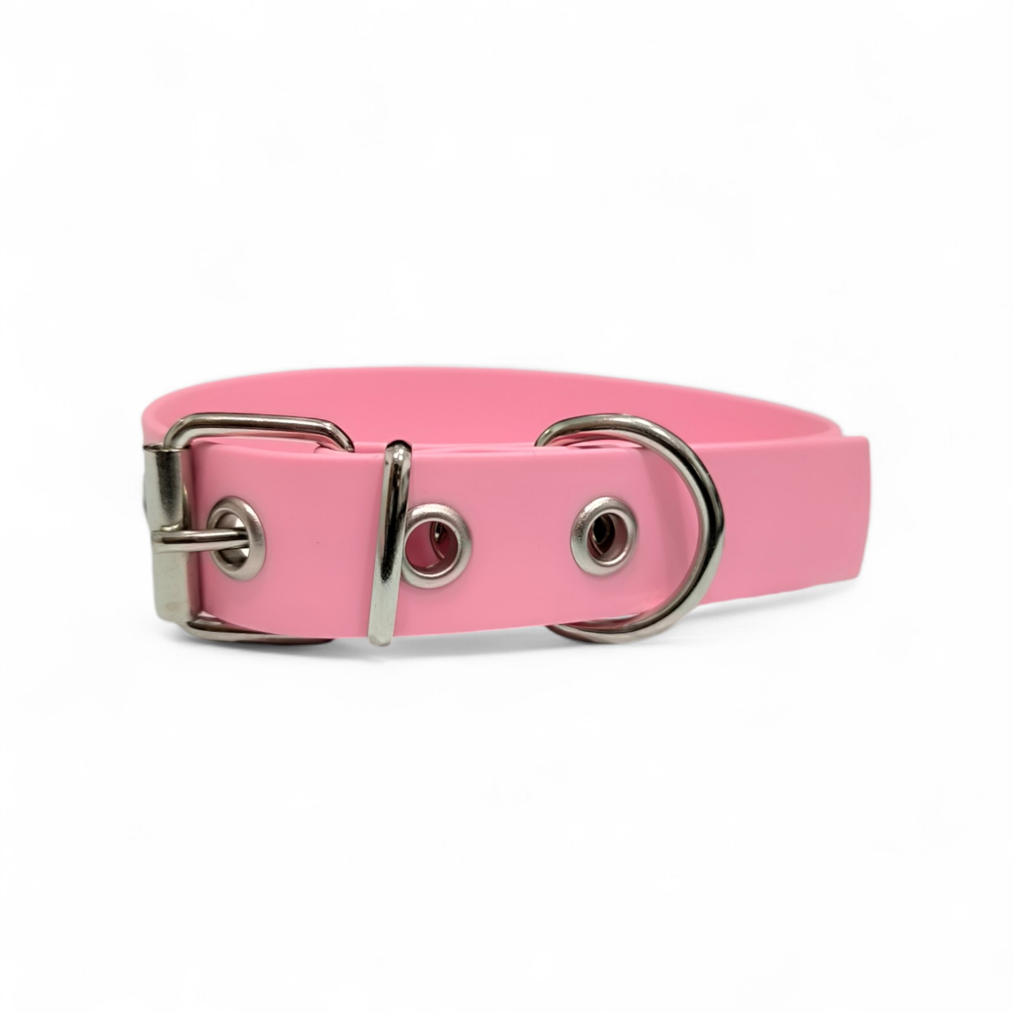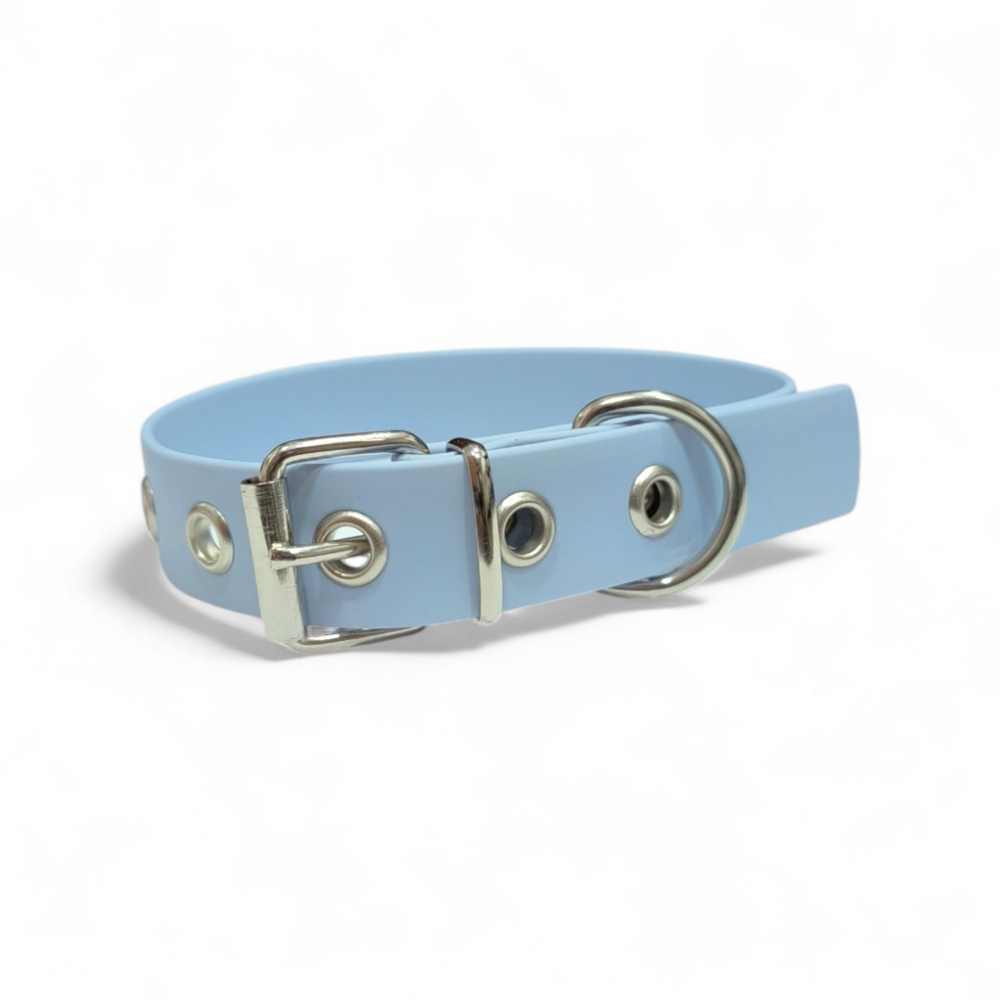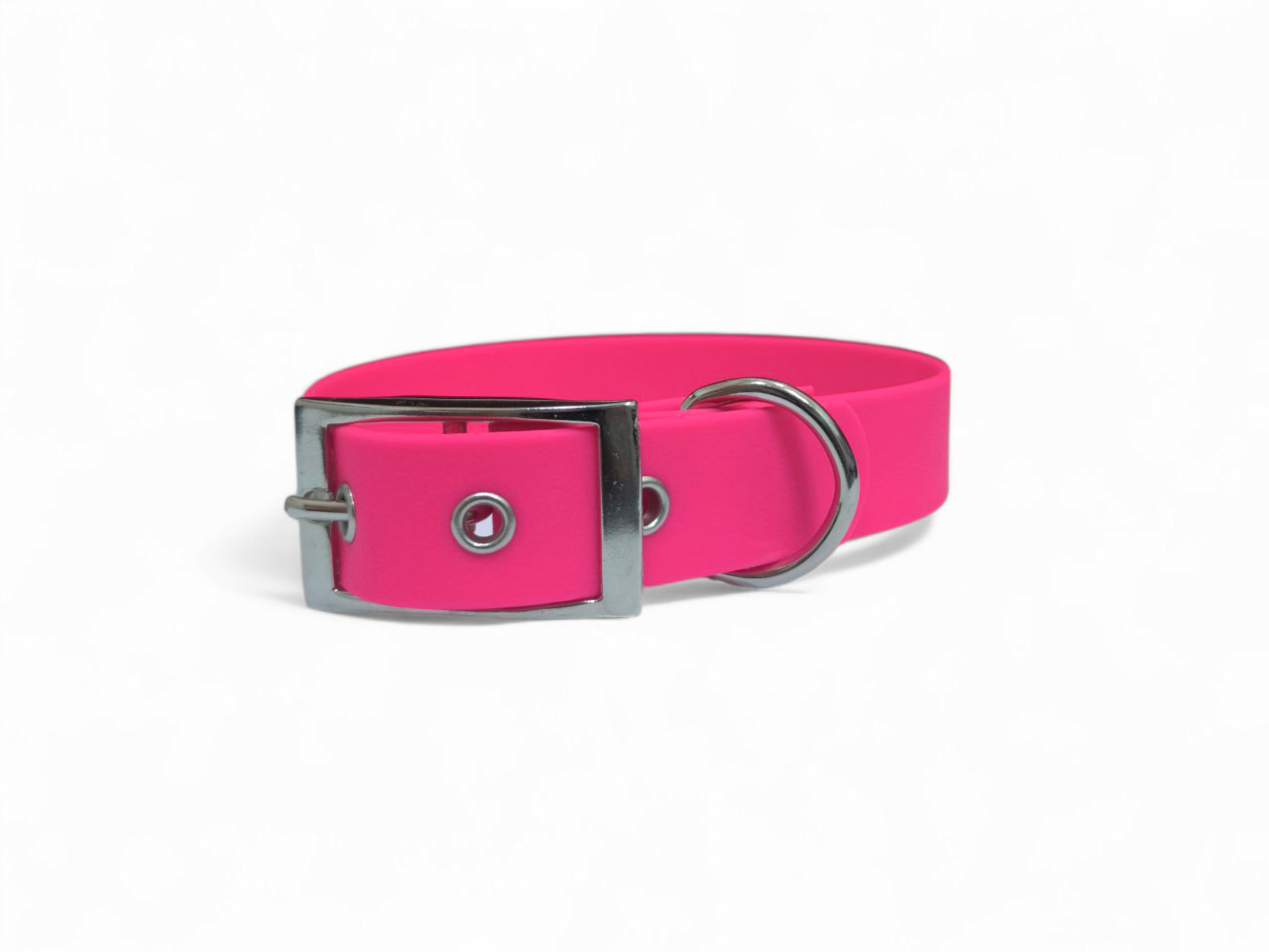 Collar impermeable fabricado en material resistente, ideal para perros activos. Fácil de limpiar, no absorbe humedad ni olores y mantiene su durabilidad incluso con uso diario, disponible para todos los tamaños.