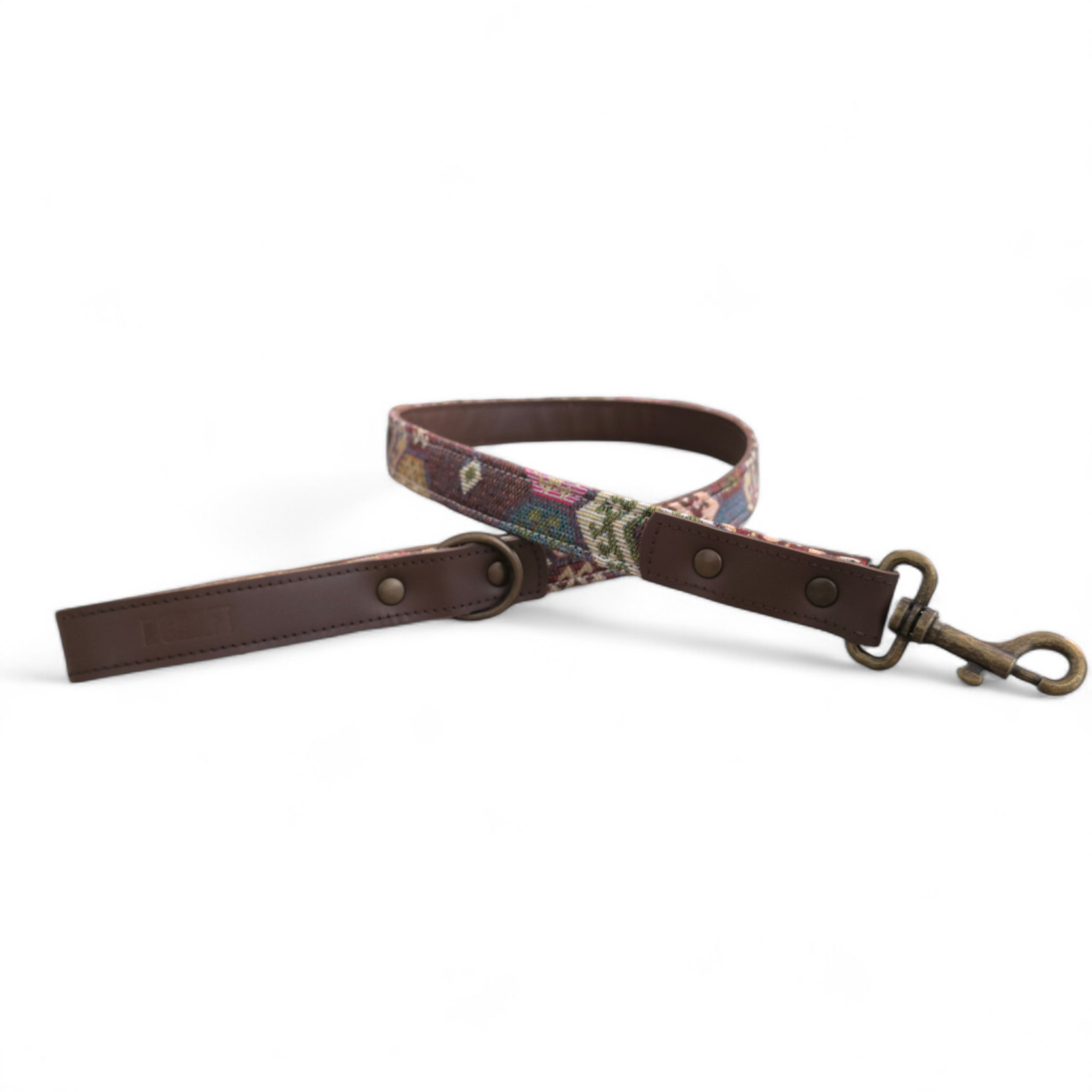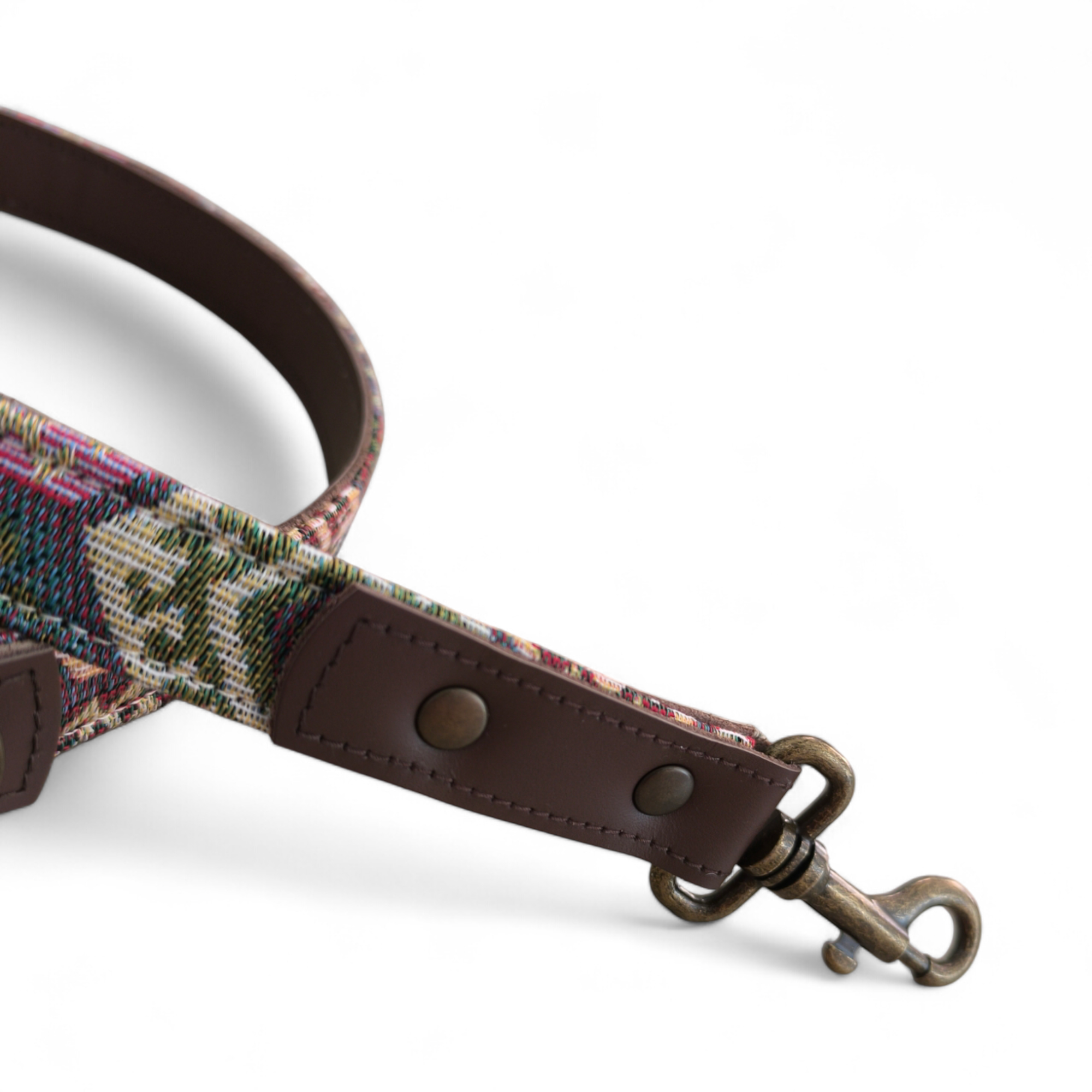 Correa fabricada en cuero de alta calidad, combinada con tela alpujarreña para un diseño exclusivo y distintivo, con longitudes de 1,10 m y anchos de 2 o 2,5 cm para un control óptimo. Equipada con mosquetón resistente y anilla auxiliar para accesorios, ofrece durabilidad, comodidad y un acabado artesanal pensado para mayoristas y profesionales del sector pet.