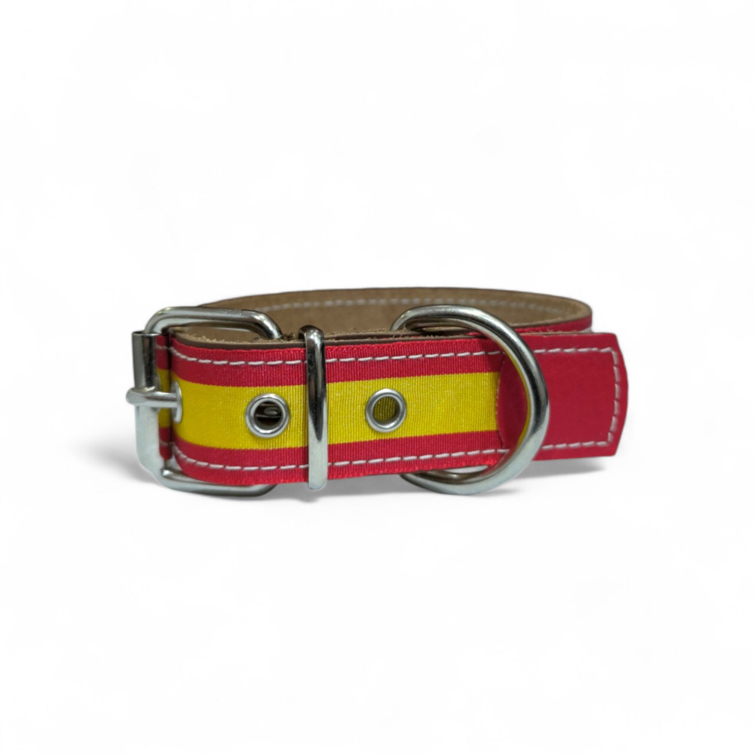 Collar en cuero de vacuno con adorno de bandera grande. Fabricado en todas las tallas, con opción de elegir distintos acabados de fornituras (oro, plata, negro, etc.). Se puede añadir logo grabado a fuego.