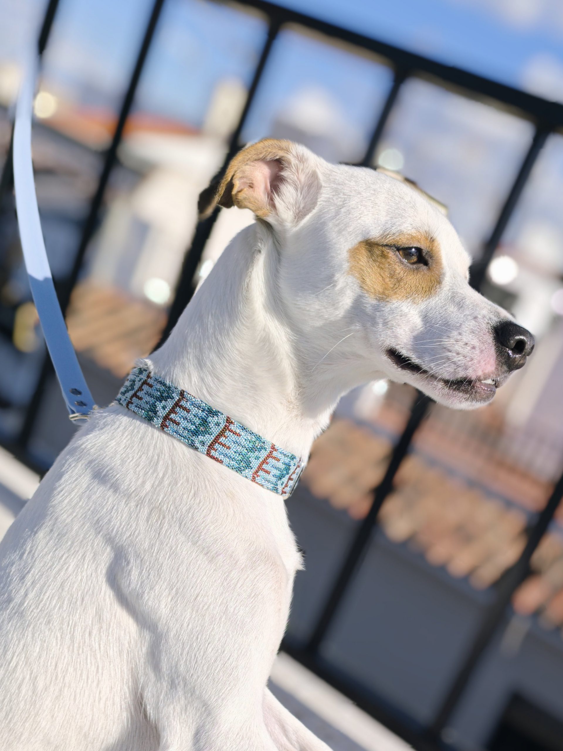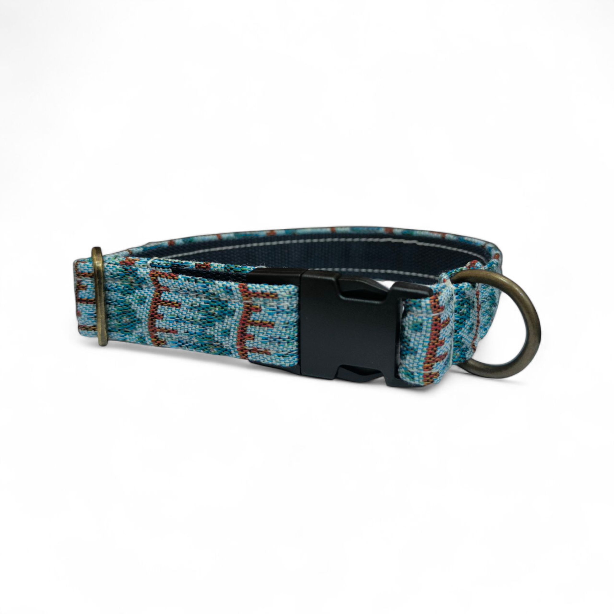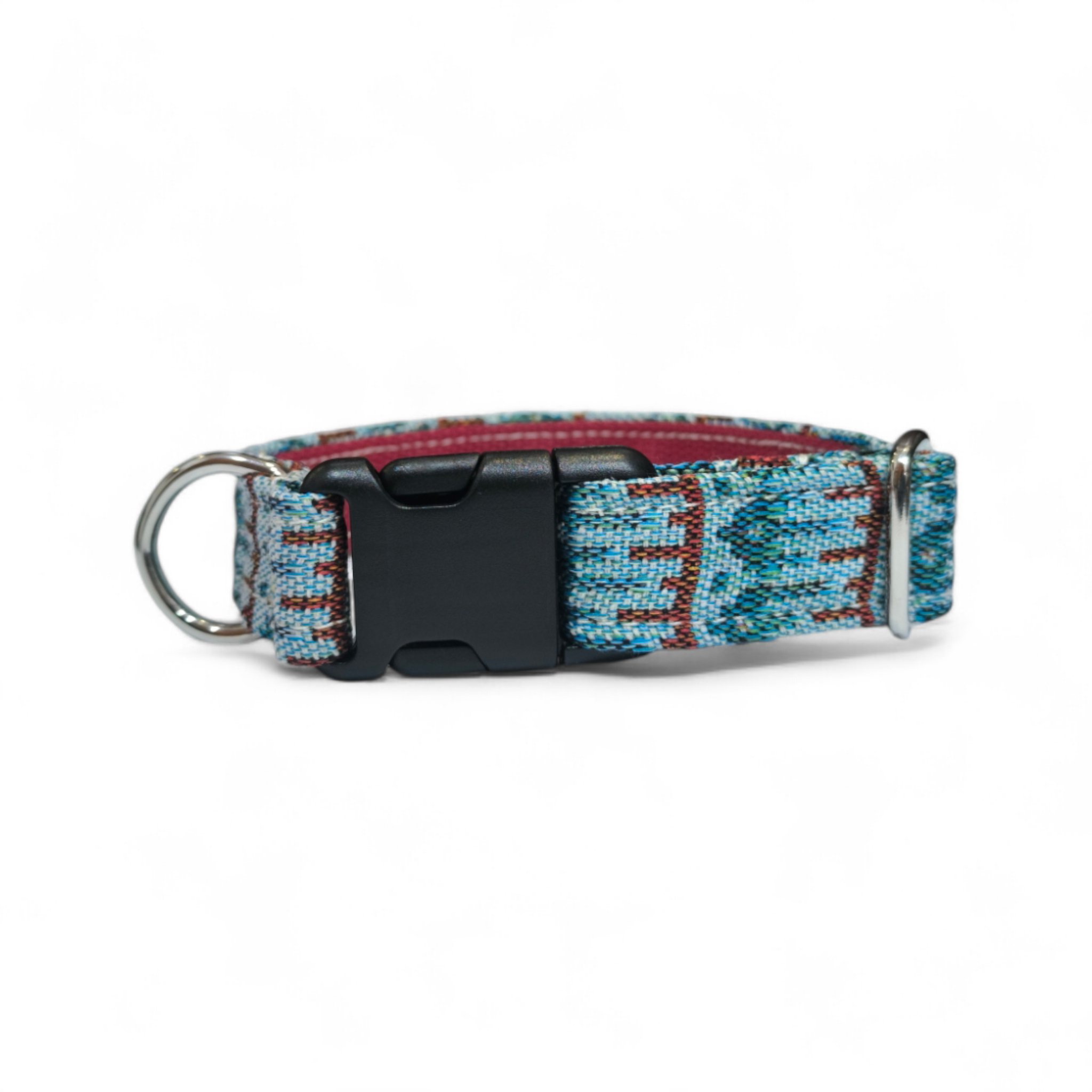 Collar regulable confeccionado en tela de alta calidad, interior con nailon resistente y cómodo. Disponible para todo tipo de perros. Se puede fabricar con diferentes acabados de fornituras (oro, plata, negro, etc.) y opción de personalizar con el logo de tu negocio.