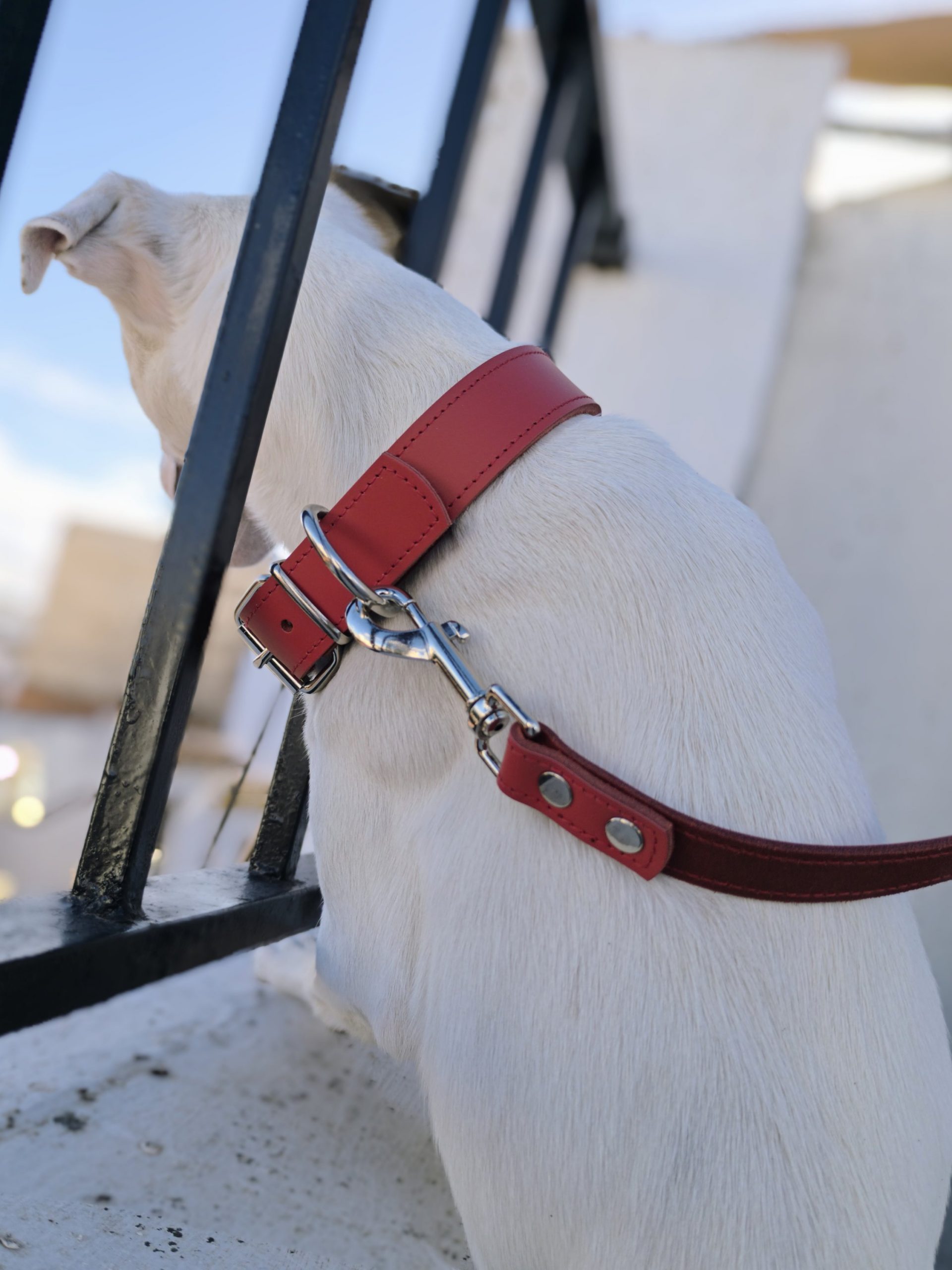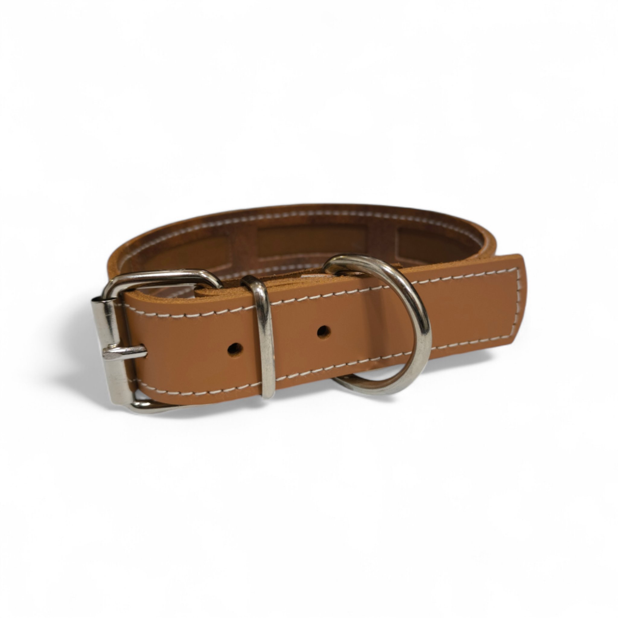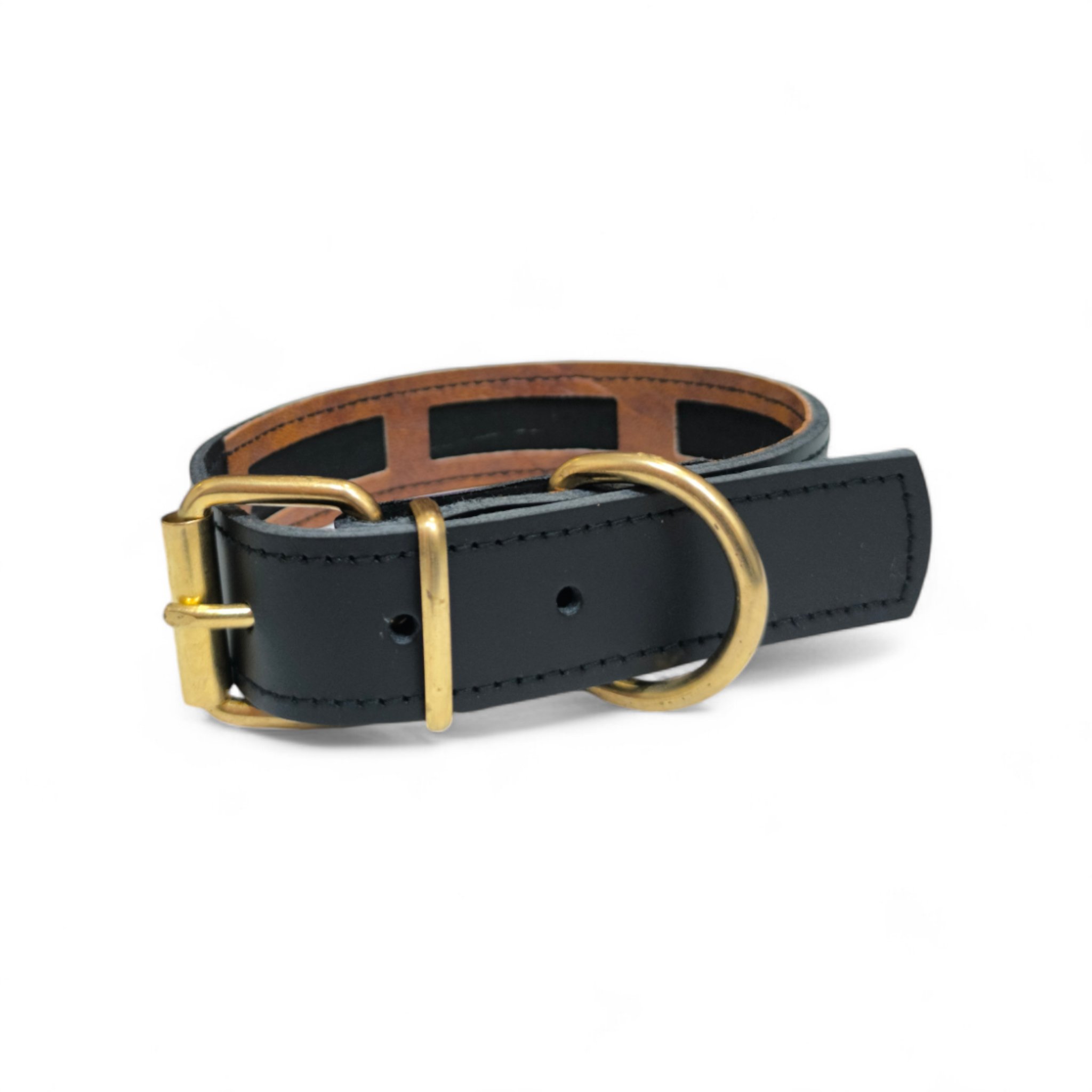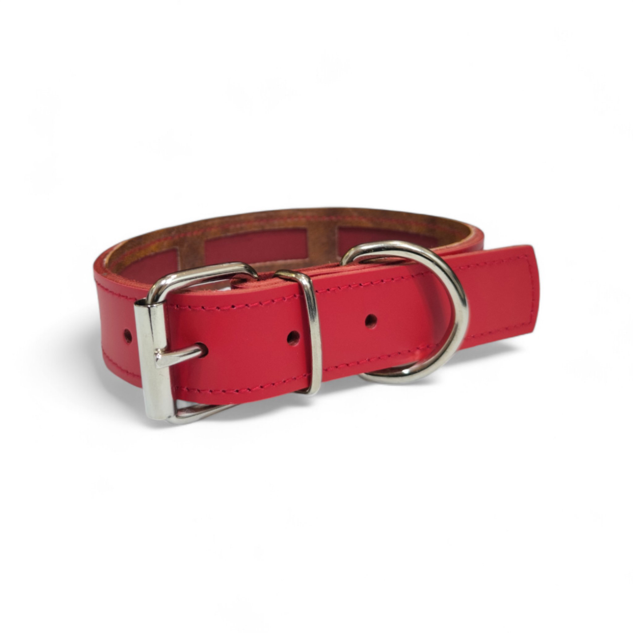 Collar en cuero de vacuno con funda para proteger el collar antiparasitario, disponible en tonos marrón, negro, rojo y camell. Fabricado para perros medianos y grandes, con opción de elegir distintos acabados de fornituras (oro, plata, negro, etc.). Se puede añadir logo grabado a fuego.