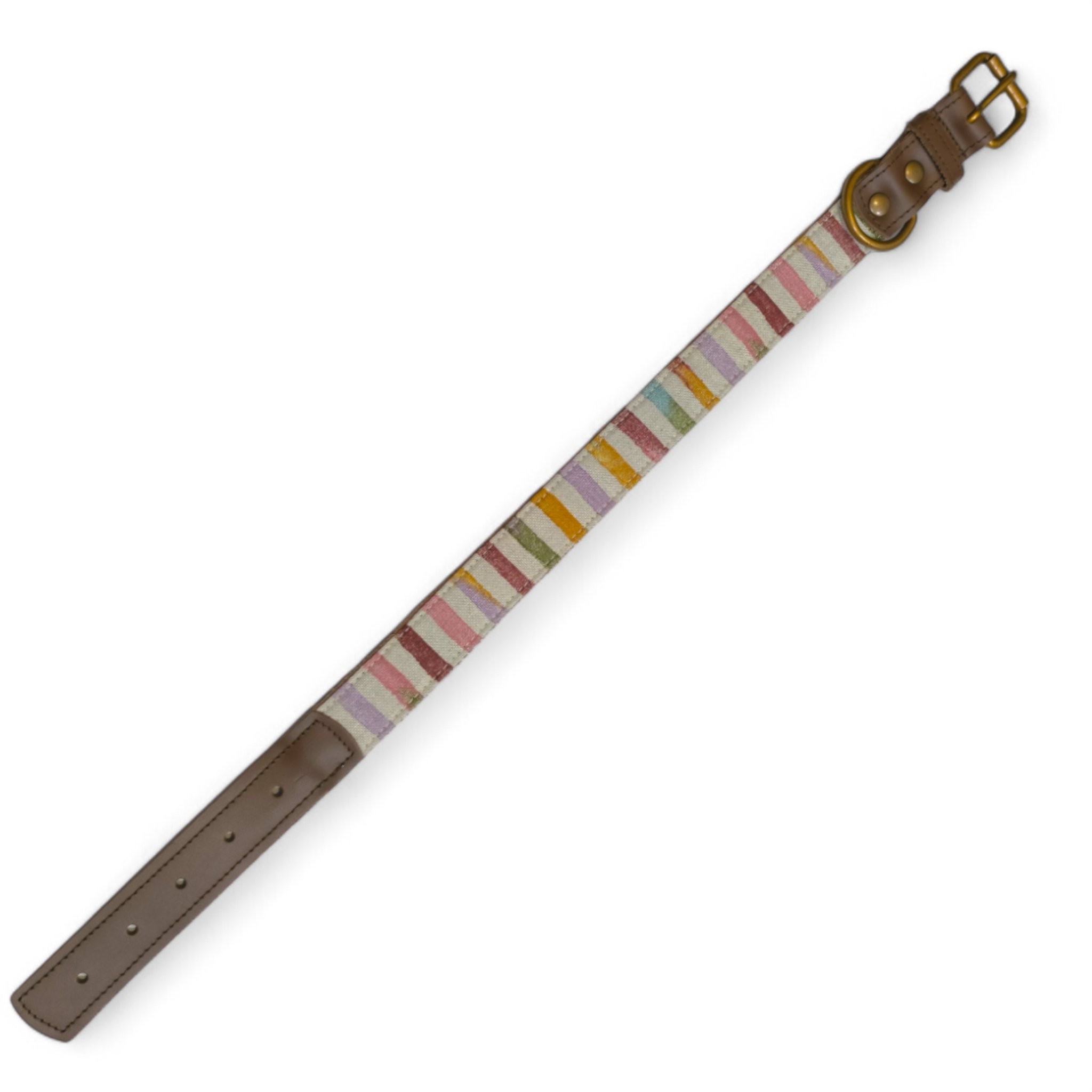 Collar en cuero de vacuno marrón con tela étnica. Fabricado en todas las tallas, con opción de elegir distintos acabados de fornituras (oro, plata, negro, etc.). Se puede añadir logo grabado a fuego.